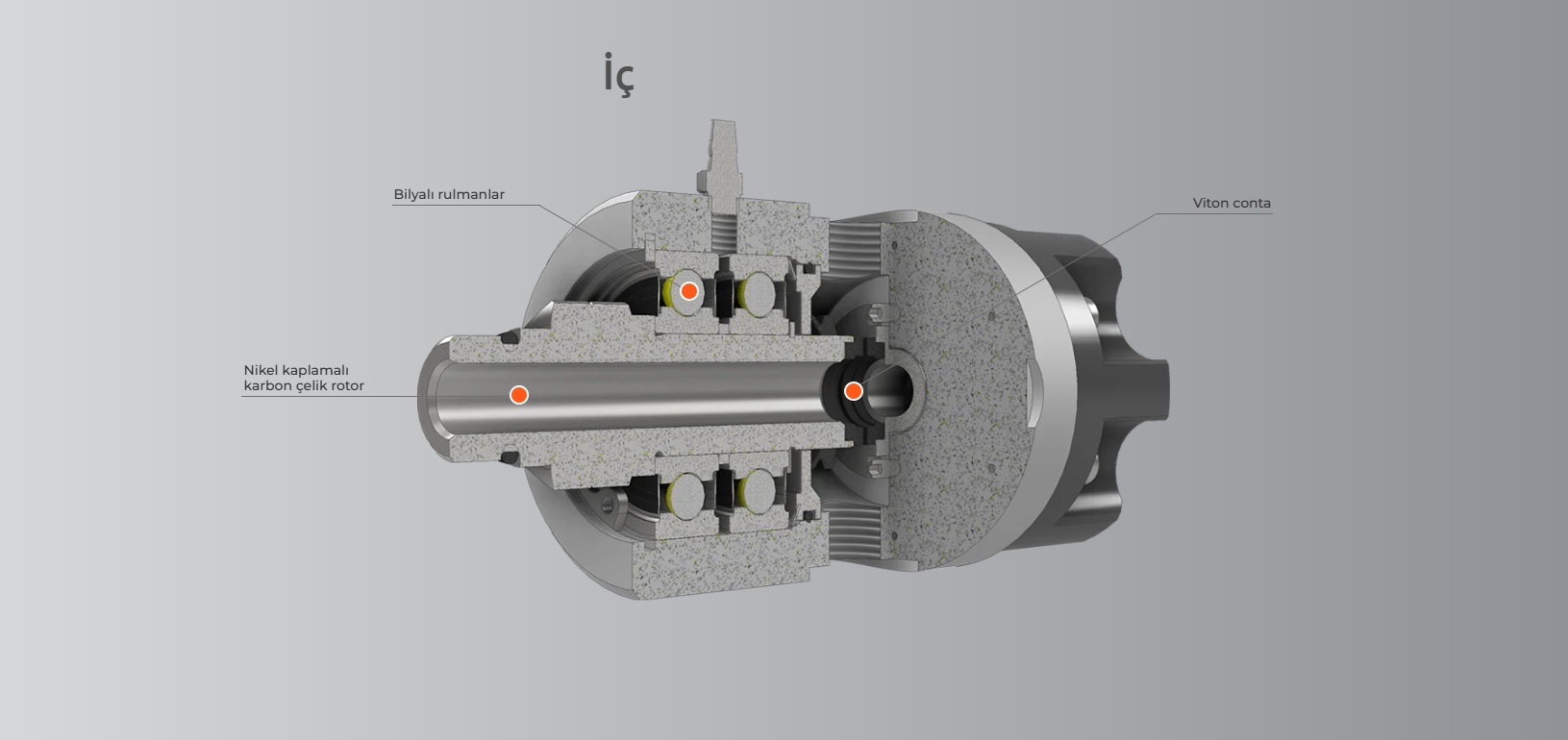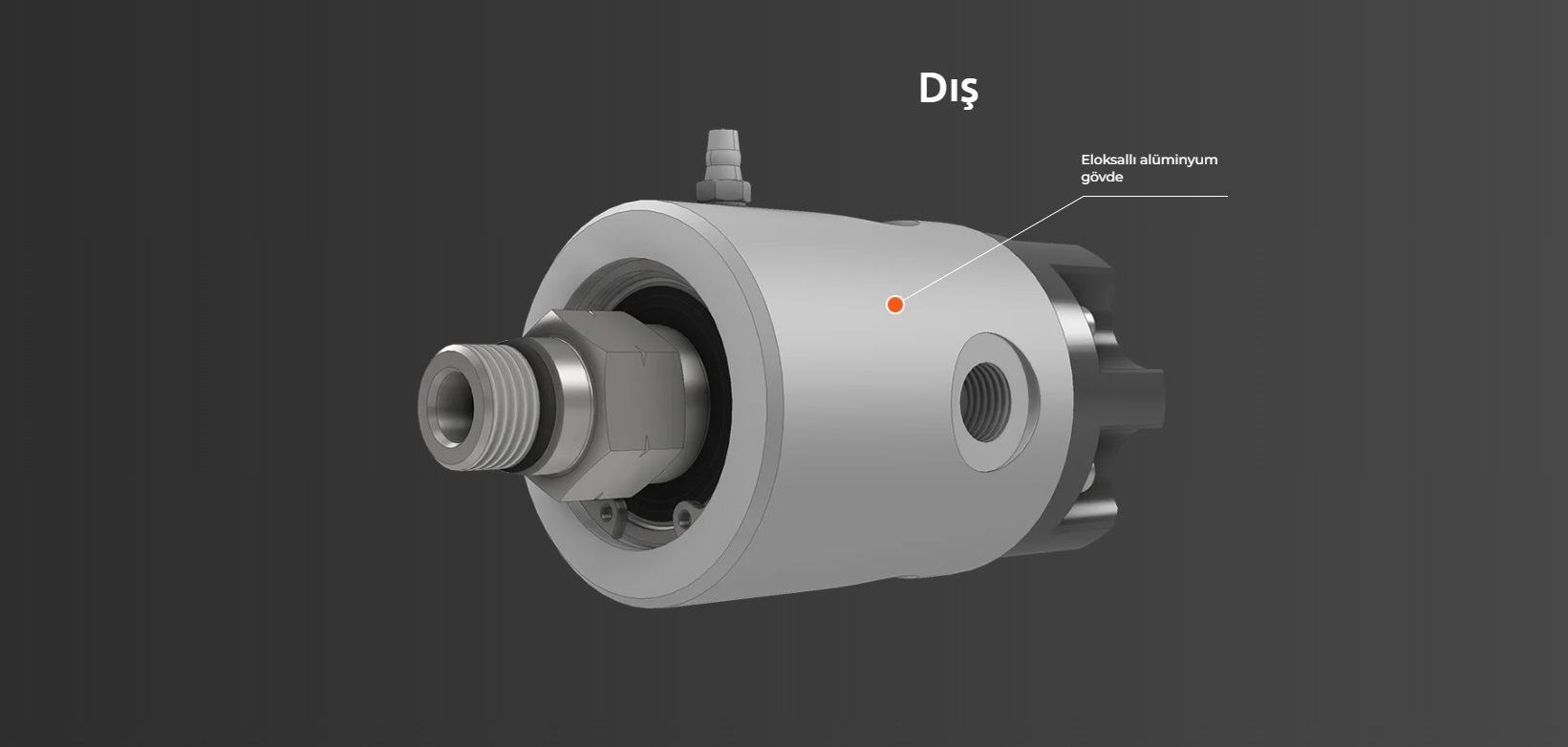 Bu tür döner bağlantı elemanları, 20.000 RPM'lik yüksek dönüş hızına kadar sıvıların geçişi olmadan kuru çalışabilir. Sabit dış parça eloksal alüminyumdan, döner parça ise paslanmaz çelikten üretilmiştir.