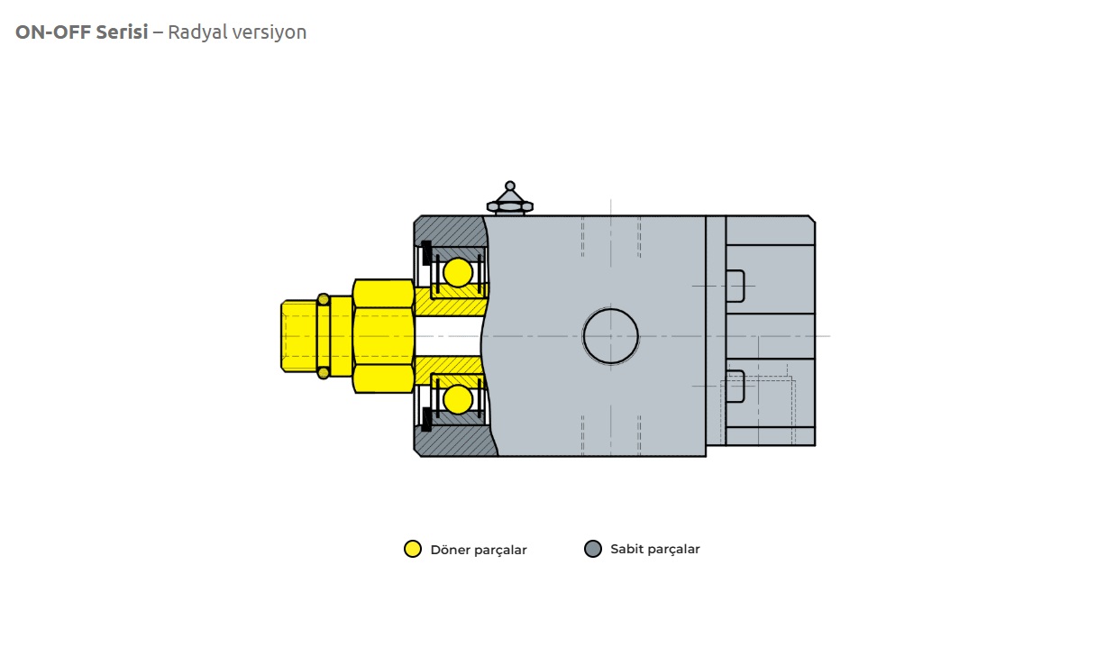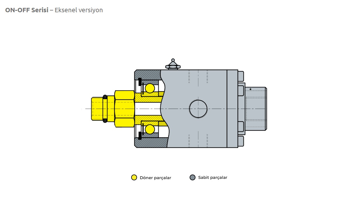 ON-OFF serisi rotary joint, soğutma sıvılarının makine takımlarının millerinden geçmesi için tasarlanmıştır.